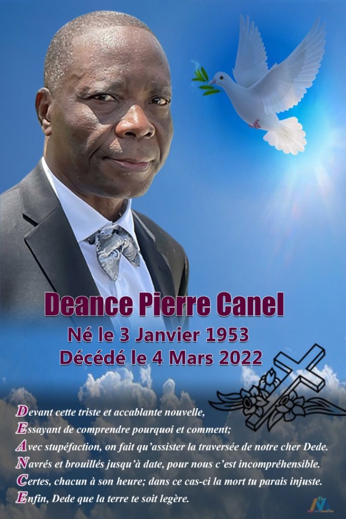 Les funérailles de Mr. DEANS seront chantées le Samedi 19 Mars 2022 à partir de 8h A.M à l’Eglise Saint-Pierre de l`Arcahaie après l’exposition de sa dépouille au SALON FUNERAIRE ALWAYS de Saint-Médard dès 7h A.M.