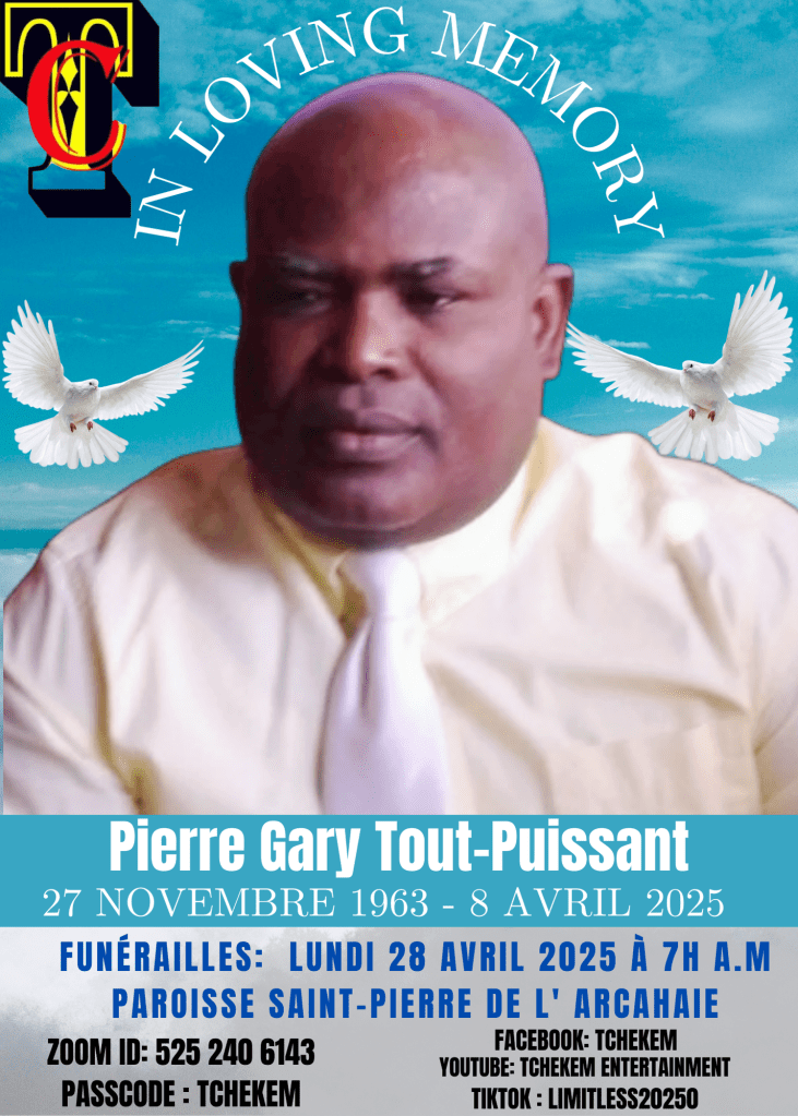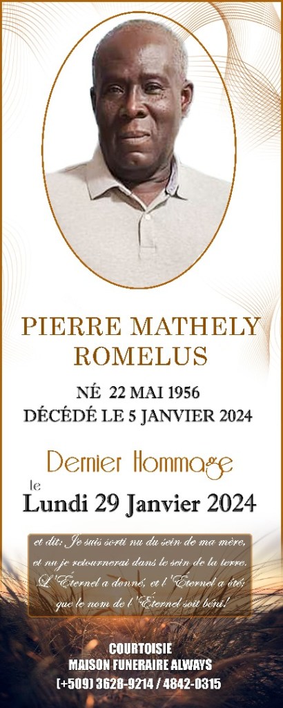 Lieu des funérailles: Église Saint-Pierre de l’Arcahaie. Exposition: Salon funéraire ALWAYS dès 7h. A.M.