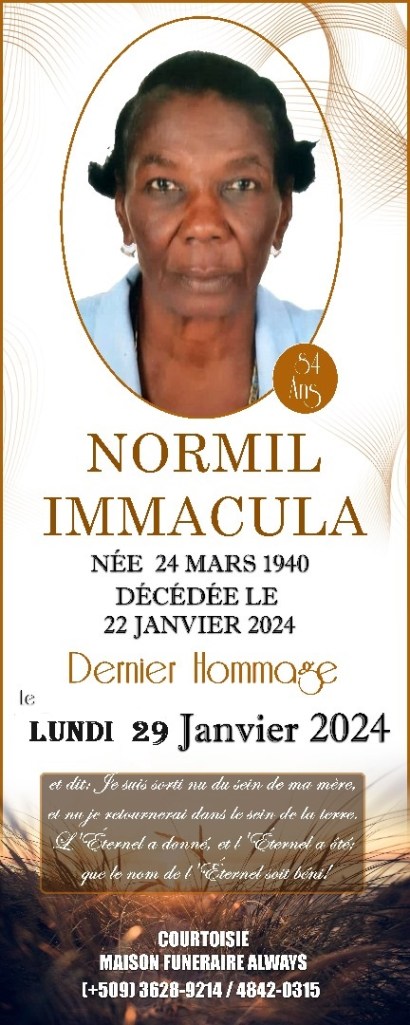 ANNONCE FUNEBRE DE Mme LORMELA NICOLAS décédée le 4 Mars 2022 a L’âge 94 ans; les Funérailles de Lormela seront chantées le Vendredi 18 Mars 2022 a l'Eglise Saint-Pierre de l`Arcahaie, a partir de 3h p.m. .la dépouille sera exposée au salon funéraire de ALWAYS des 2h p.m. pou ensuite procéder a son inhumation au cimetière principale de l`Arcahaie. En cette pénible circonstance, la MAISO FUNERAIRE ALWAYS Présente ses sympathies a sa famille, aux parents et amis affectés par ce deuil.